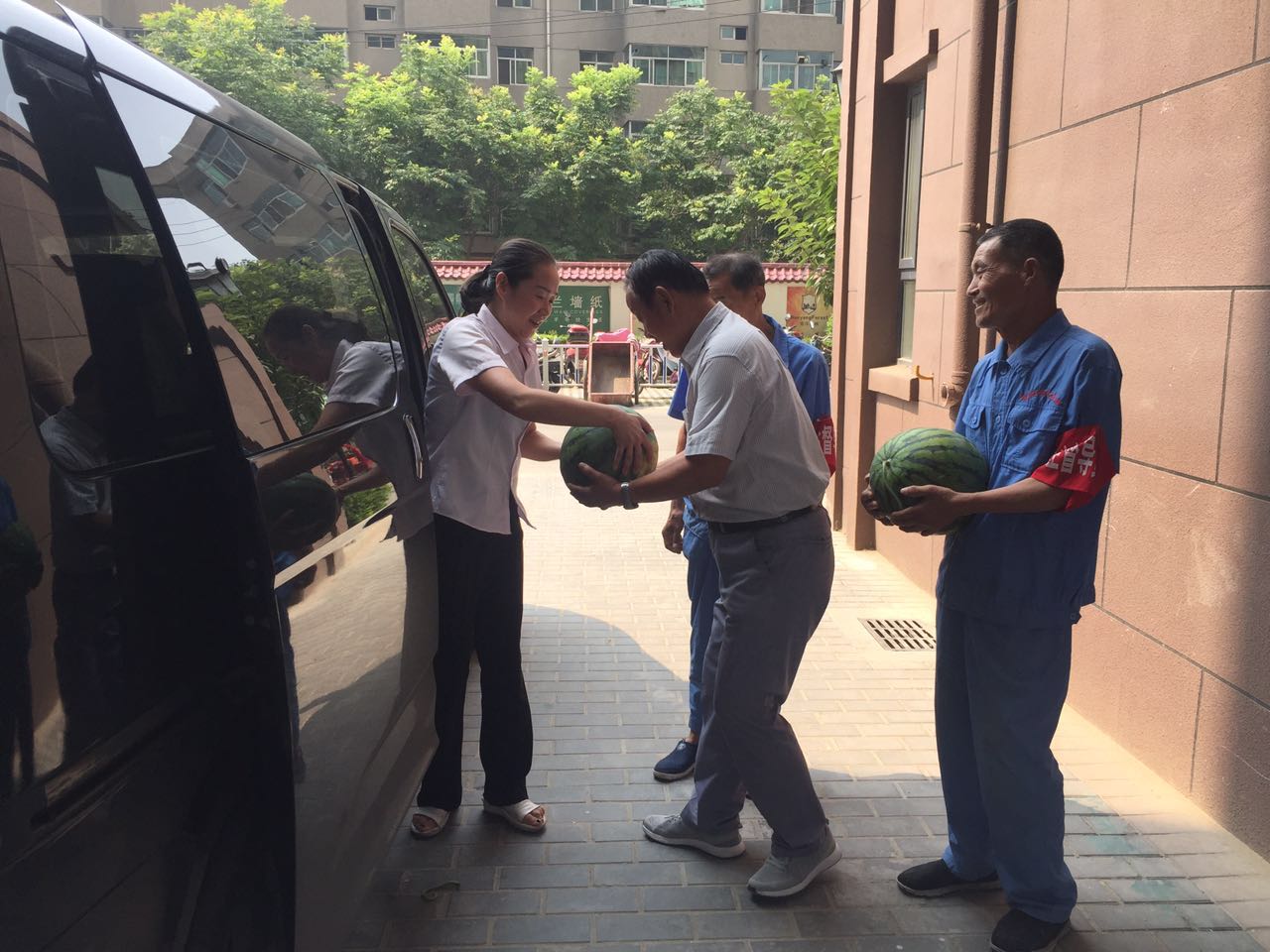 當(dāng)日上午,總經(jīng)理趙明海、工會(huì)主席常紅艷等人一行來到河南街、安谷苑、九冶、城投時(shí)代進(jìn)行慰問,向一線職工送去800余斤西瓜。慰問組每到一處,親切詢問保安保潔的生活情況和工作狀況,叮囑他們要注意防暑降溫,并對(duì)保安保潔近期以來的勤懇勞動(dòng)表示感激和關(guān)懷之情,叮囑他們?cè)?/FONT>開展“創(chuàng)文”整治工作以來,保潔員隊(duì)伍人員少、天氣熱、任務(wù)重的情況下,在提高小區(qū)環(huán)境質(zhì)量的同時(shí),要做好遮陽等保護(hù)措施,注意勞逸結(jié)合,預(yù)防中暑。