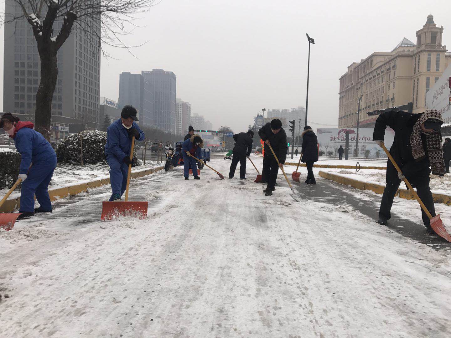 由于氣溫較低,主干道路的雪被壓得很瓷實,清掃工作十分困難。天氣雖然寒冷,但是大家熱情高漲,即使手凍的通紅,也擋不住大家的干勁。都爭先恐后,團結協(xié)作、井然有序,掃的掃、鏟的鏟,干勁十足,一心想著將路面的積雪盡快清除,經過一天的奮戰(zhàn),基本將包抓路段、主干道積雪清掃干凈,確保了廣大居民、業(yè)主的出行安全。